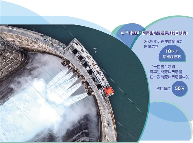 为实现可再生能源高质量跃升发展,《规划》锚定碳达峰、碳中和目标,紧紧围绕2025年非化石能源消费比重达到20%左右的要求,明确2025年可再生能源消费总量达到10亿吨标准煤左右,“十四五”期间可再生能源消费增量在一次能源消费增量中的占比超过50%。